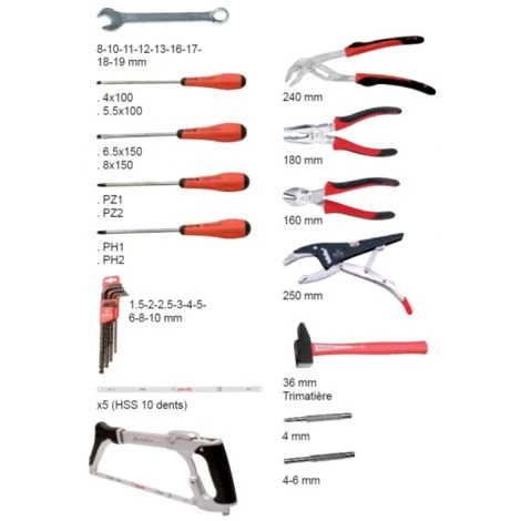 Caisse Ă outils mĂ©tal garnie de 40 piĂ©ces de base. IdĂ©al pour dĂ©buter avec du matĂ©riel bĂ©nĂ©ficiant de la garantie Total Mob Outillage sans limite de temps! BoĂ®te outils 5 cases 450mm garnie de 40 outils : 9 clĂ©s mixtes : 8-10-11-12-13-16-17-18-19 mm8 tournevis manche bimatière REDGRIP :- Electricien : 4x100x0,8 – 5.5x100x1 – MĂ©canicien : 6,5x150x1,2 – 8x150x1,2- Phillips : Ph1 – Ph2- Pozidriv : Pz1 – Pz29 clĂ©s mâles hexagonales tĂŞte sphĂ©rique en Ă©tui : 1.5-2-2.5-3-4-5-6-8-10 mm3 pinces bimatière :- 1 universelle de 180 mm- 1 coupante diagonale de 160 mm- 1 multiprise becs effi lĂ©s 240 mm1 pince Ă©tau Ă becs longs 250 mm1 scie Ă mĂ©taux MĂ©talcut (monture bimatière)5 lames de scie HSS 10 dents/cm1 marteau rivoir de 36 mm manche trimatière2 chasse-goupilles moletĂ©s : 4-6 mm1 pointeau de mĂ©canicien : 4 mm De la BoĂ®te Ă Outils : AccessibilitĂ© maximum : Grande ouverture SĂ©curitĂ© : Verrouillable par cadenas RĂ©sistance aux chocs accrue : Peinture epoxy PoignĂ©e confortable : PoignĂ©e tubulaire StabilitĂ© : Ouverte ne bascule pas Anti-dĂ©formation : Caisson rigide Robustesse : Rivets renforcĂ©s Poids : 10.80 Kg environ Garantie Totale Mob Sans Limite de Temps