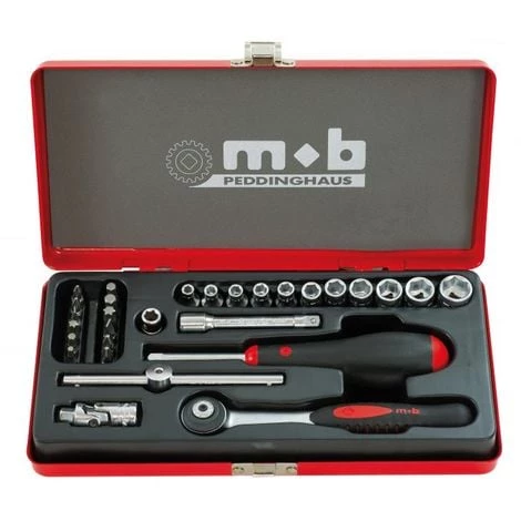Mallette mĂ©talique MOB 1/4 6 pans avec douilles, embouts, cliquet, rallonge etc pour vos travaux de bricolage. Très pratiques et resistants : Bon maintient des pièces et verrouillage rapide sur le cliquet.   Contient : 1 cliquet rond 11 douilles : 4-4,5-5-5,5-6-7-8-9-10-11-13 mm 1 cardan 1 poignĂ©e coulissante 1 rallonge 75 mm 1 poignĂ©e tournevis 1 douille porte-embouts 12 embouts de vissage : 2 fentes : 4-5 mm2 Philips : PH1-PH22 Pozidriv : PZ1-PZ22 Torx : T30-T404 Hexagonaux : H3-H4-H5-H6    Garantie Ă vie sur la plupart des outils MOB. Â