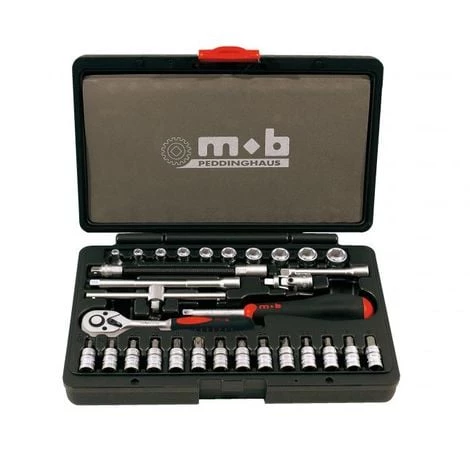 Coffret plastique MOB 31 pièces : Un cliquet poire : levier de changement de sens intĂ©grĂ© dans la tĂŞte = pas de risque d’inversion accidentelle. Changement de sens par le pouce. Douilles 4- 5- 6- 7- 8- 9- 10- 11- 12- 13 mm 1 cardan universel 1/4″ 2 rallonges 1/4″ 75 – 125mm 1 rallonge flexible 150mm 1 poignĂ©e coulissante 1/4″ 1 poignĂ©e de tournevis 1/4″ bimatière Douilles tournevis 1/4″ Ă fente 4-5,5 mm Douilles tournevis Philips 1/4 PH1 – PH2 Douilles tournevis hexagonales H3-H4-H5-H6 Douilles tournevis Torx T10-T15-T20-T25-T30-T45   Dimensions : 260x175x60 mm   IdĂ©al pour un cadeau ou pour avoir un coffret Ă douilles complet Ă portĂ©e de main   Â
