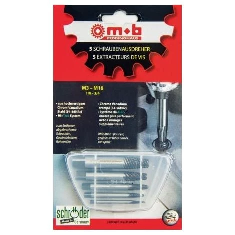 Description et utilisation des extracteurs de vis cassĂ©es M4 Ă M18 :   Jeu de 5 extracteurs M4 Ă M18 UilisĂ© pour vis et goujons cassĂ©s, noyĂ©s, sans prise UtilisĂ© après le perçage de la vis, avec une clĂ©, un porte outils Ă cliquet ou un tourne Ă gauche Version Hi-Trac : usinage supplĂ©mentaire pour une meilleure performance d’exctraction DuretĂ© : 54-56 HrC Dimensions en mm : 95 x 55 x 15    Brevet EU 01125106.3-2302   Garantie 10 ans