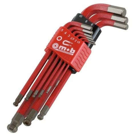 Jeux de clés mâles 6 pans longuesJeu de 9 clés mâles 6 pans à tête sphérique aimantée Clés mâles 6 pans bouts aimantés avec gainage PVC expansé souple, antiglisse et antigraisse.Composition : 1,2 -2 -2,5 -3 -4 -5 -6 -8 -10 mm.