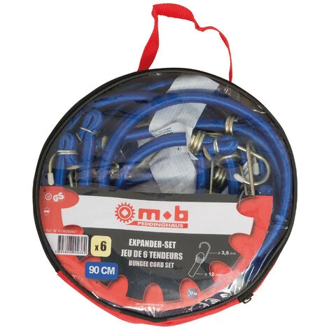 Trousse de 6 tendeurs rĂ©sistants – crochet nickelĂ© à ¸3,5mm – âme à ¸12mm en caoutchouc synthĂ©tique recouvert de textile polypropylène – charge maximale d’utilisation : 12 kg – charge de rupture : 48 kg – conforme Ă Â la norme GS