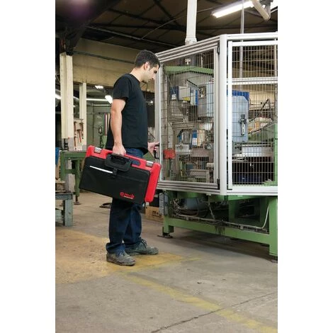 - Textile 1200 D anti-déchirure, poignée élastomère, 2 zips, plaque et rails en plastique injecté, poche extérieure, verrouillage par sangle.