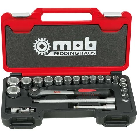17 douilles 6 pans : 8/10/11/12/13/14/15/16/17/18/19/21/22/24/27/30/32 mm // 1 cliquet rond // 1 cardan // 2 rallonges : 125 et 250 mm