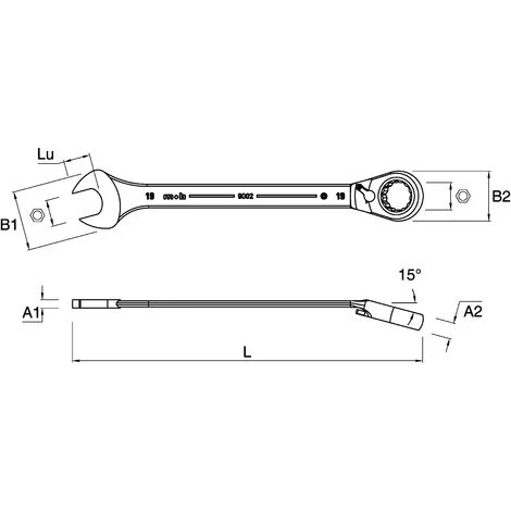 - Un côté rapide avec le cliquet et un côté fourche pour serrer, dès que le blocage est atteint côté cliquet (ne pas forcer sur le cliquet). ISO 1711-1