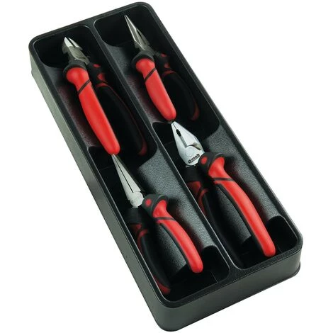 Dans ce module thermoformé de 385 x 165 mm il y a : 1 pince universelle 180 mm 1 pince coupante diagonale 180 mm 1 pince becs plats 170 mm 1 pince becs demi-ronds 170 mm.