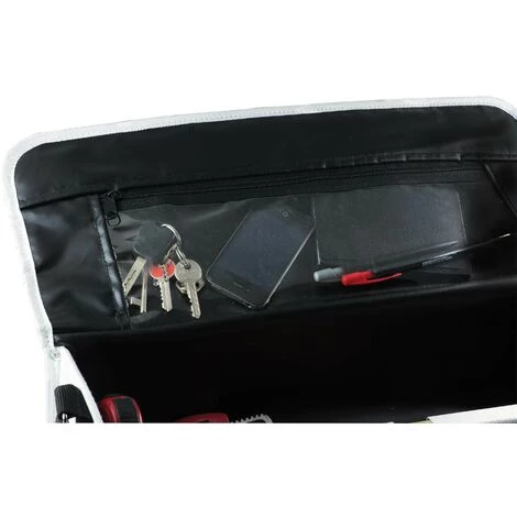 - 4 poches intérieures pour le rangement du petit outillage : pinces, clés, tournevis, clés mâles…,1 poche fermée par zip dans le couvercle pour accueillir documents, clés, stylos, téléphones et 1 boucle pour mesure.
